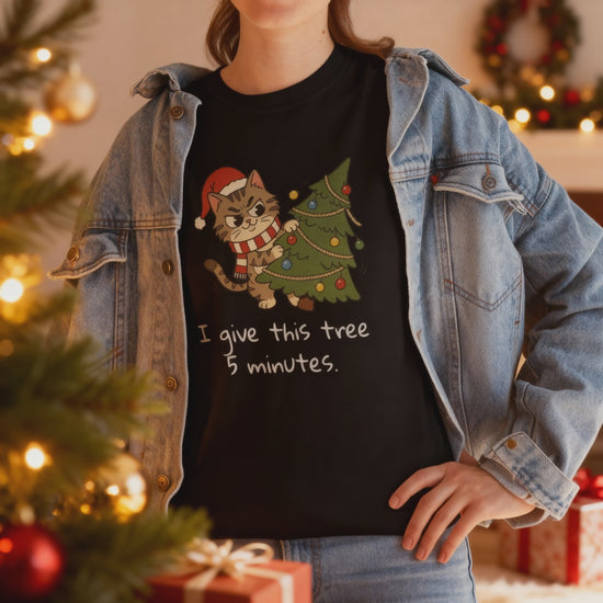 Celebrate the holiday season with a splash of humor and adorable charm in this Cat Christmas Tree T-Shirt! Perfect for cat lovers and holiday enthusiasts alike, this funny holiday tee features a playful illustration of a cheeky cat in a Santa hat, tangled in colorful string lights next to a festive Christmas tree. The hand-lettered phrase "I give this tree 5 minutes" adds a humorous touch that’s sure to spark smiles and laughter at family gatherings, cozy evenings decorating the tree, or casual outings during the holidays.